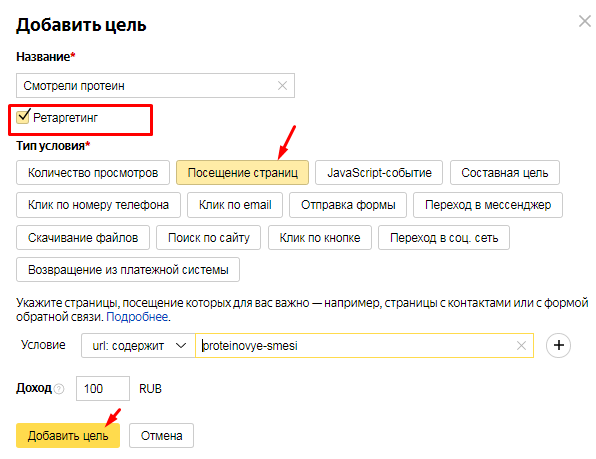 Настройка ретаргетинга начинается с создания целей в Яндекс.Метрике. Рассмотрим настройку на примере магазина спортивного протеина.
