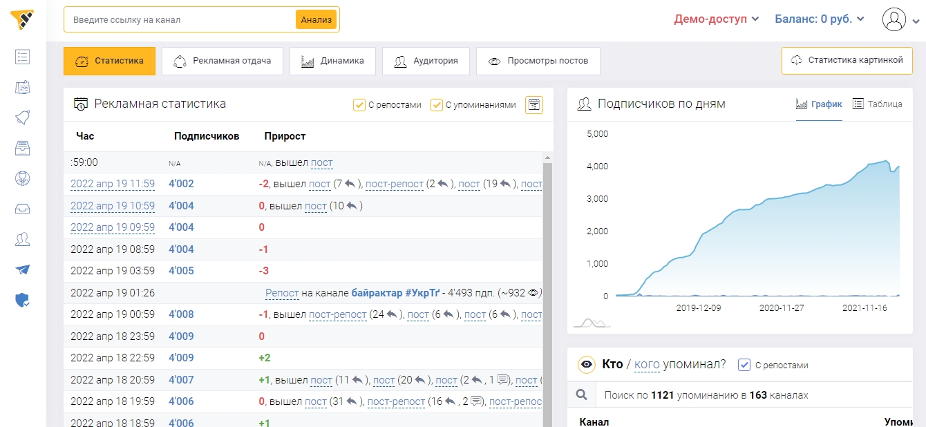 - Упоминания. Показывает, сколько раз канал упоминали в других источниках (Инстаграм*, ВКонтакте, Ютуб);