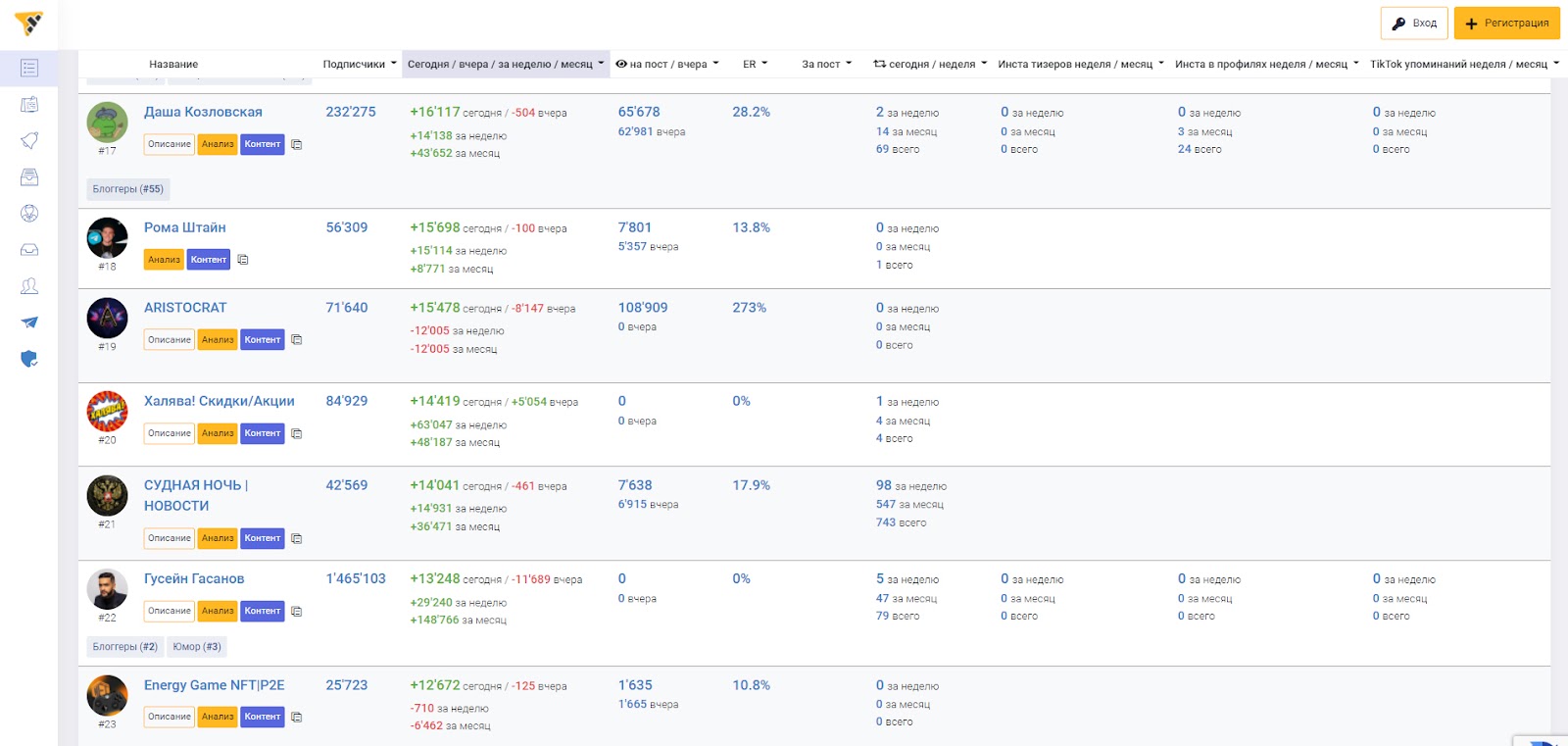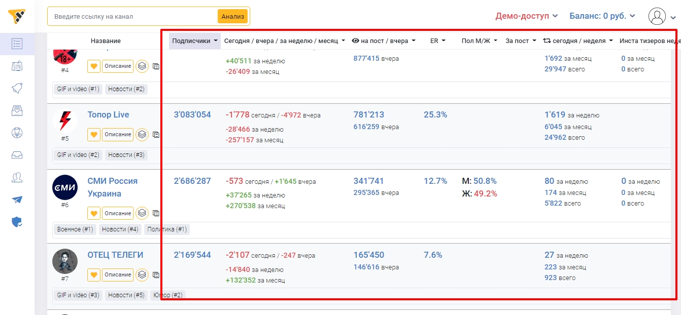 Отображаются только первые 15 каналов, но при клике на кнопку “Посмотреть все” открывается детальная статистика по каждому из более чем 3 000 сообществ: