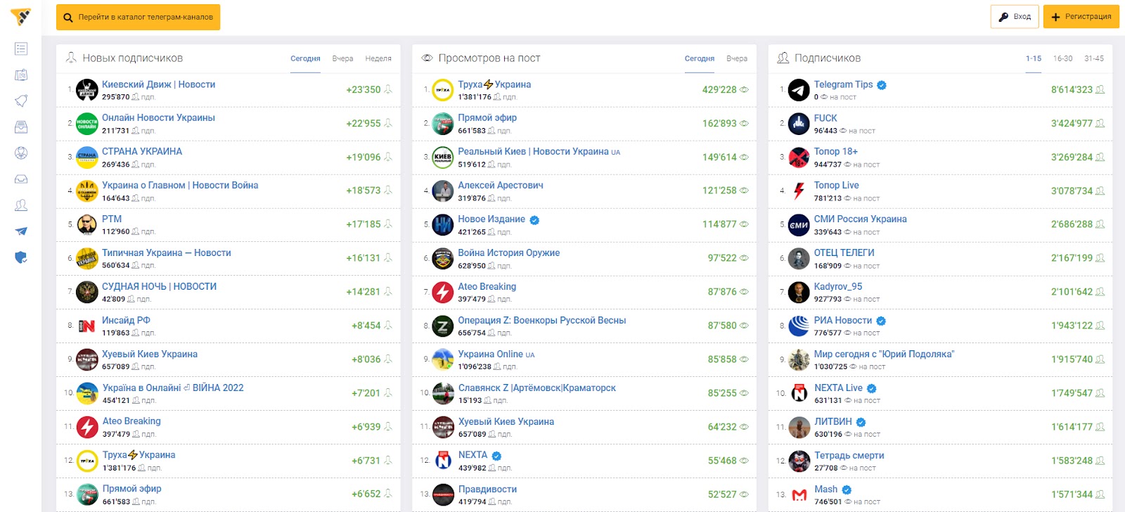 На главной странице сервиса Вы увидите ТОП по числу читателей, их приросту и количеству просмотров на одну публикацию. Данные собираются за три периода: сегодня, вчера и последнюю неделю.