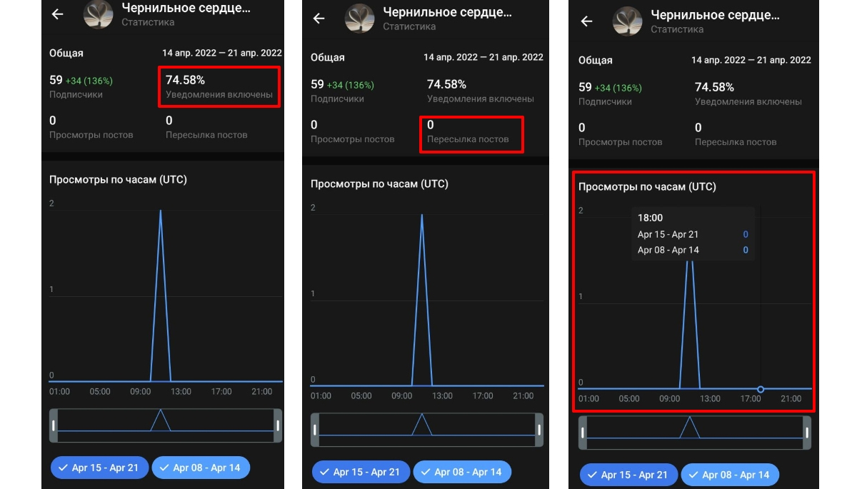 Для внутренней аналитики здесь достаточно много показателей — особенно в сравнении с ботами, о которых расскажем в следующем разделе. Помимо количества читателей и динамики их прироста Телеграм показывает следующую информацию: