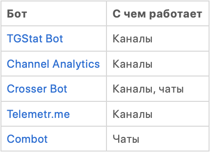 Базовые программы-помощники в Телеграме автоматически собирают данные. Они пригодятся, если Вы хотите быстро посмотреть основную статистику. Ниже приведем список актуальных инструментов: