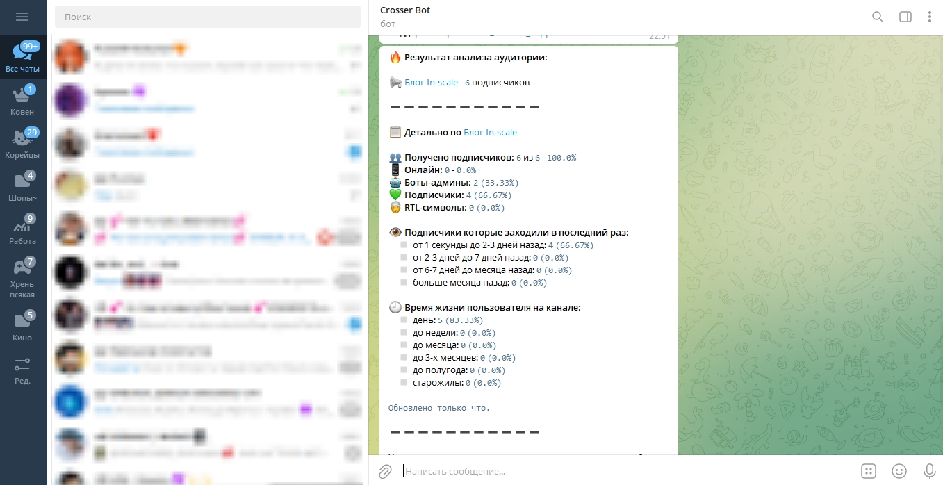 После добавления своего канала Вы увидите, сколько человек посещали блог недавно, 3 дня назад и т.д. Так Вы поймете, сколько у Вас “живых” пользователей, т.к. боты обычно не заходят в мессенджер после первой активности в блоге.