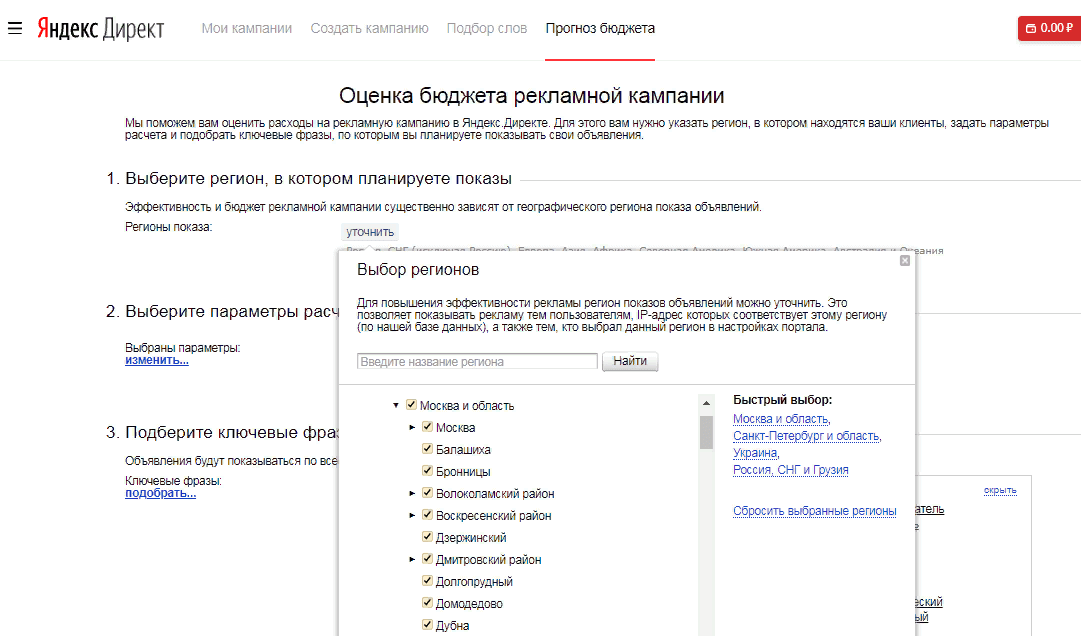 Для начала нужно узнать своих конкурентов в лицо. Самый простой способ — воспользоваться инструментами раздела «Прогноз бюджета» в Яндекс.Директ. Авторизуйтесь в сервисе, кликните по нужной вкладке и задайте настройки рекламной кампании. Укажите регион показа, применимый для вашего бизнеса. Например, если вы оказываете услуги или продаёте товары только по Москве и области, укажите в настройках только эти регионы.
