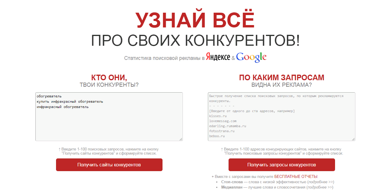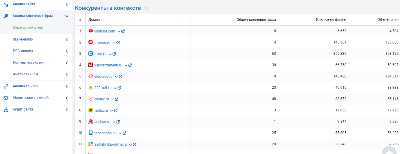 Сервис не только предоставит статистику по ключевым фразам, но и покажет конкурентов в поисковой выдаче, а также в контексте.