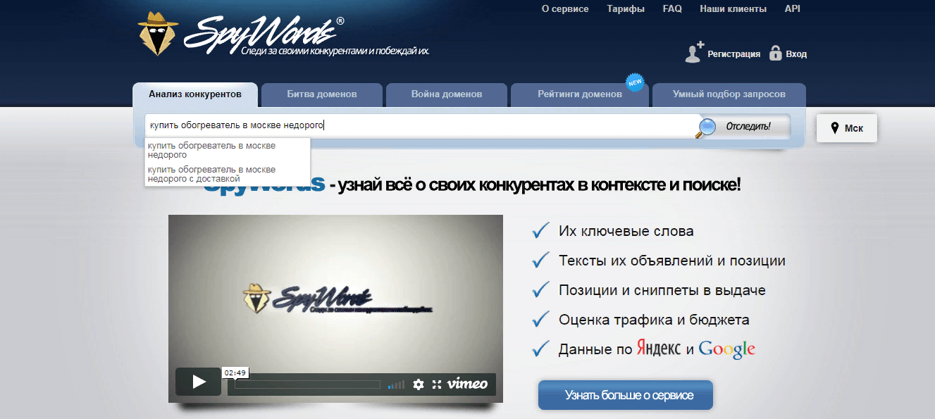 Сервис SpyWords тоже поможет проанализировать ключевые фразы конкурентов и ознакомиться с примерами их объявлений. Для этого нужно зайти на сайт, вбить в строке поиска ключевую фразу и кликнуть по кнопке «Отследить». При вводе запроса сервис выдаёт подсказки со схожими словосочетаниями.