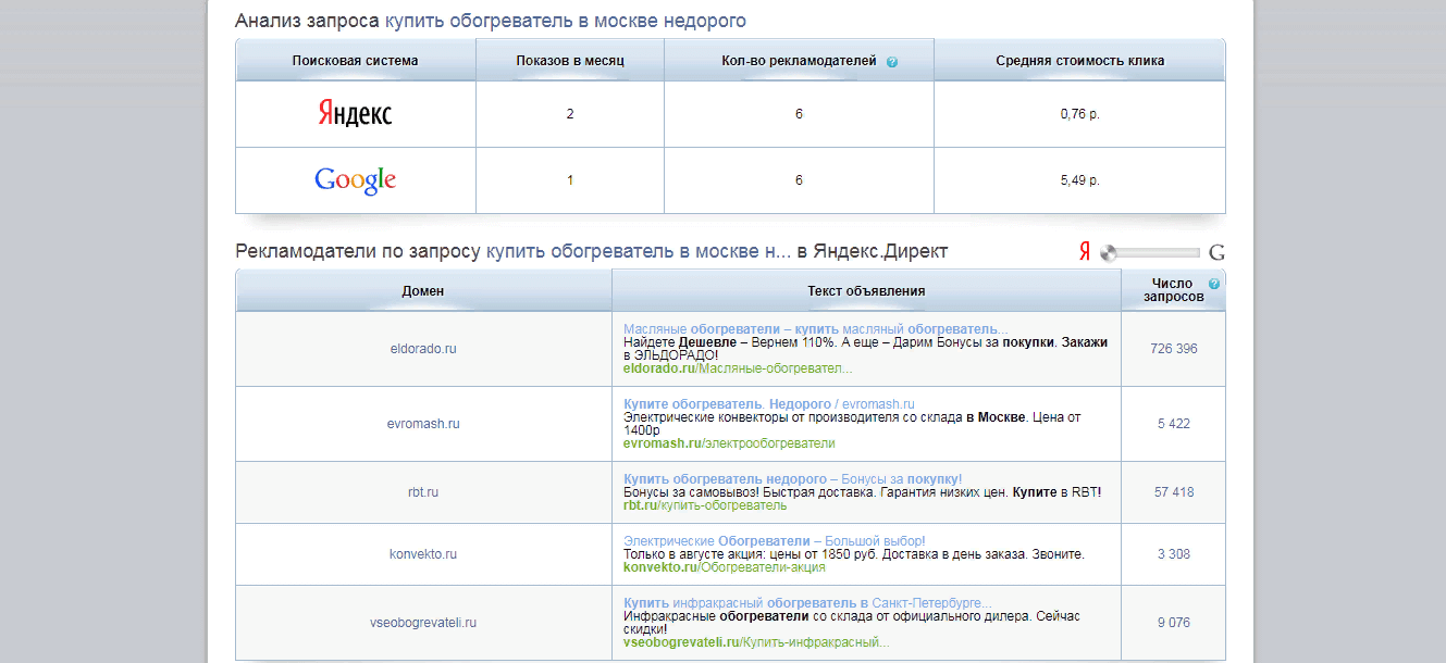 SpyWords покажет количество рекламодателей, которые используют заданную ключевую фразу, среднюю стоимость клика, число показов в Яндексе и Google. Помимо этого, сервис продемонстрирует примеры объявлений с указанием текста, ссылки на посадочную страницу и количеством запросов.