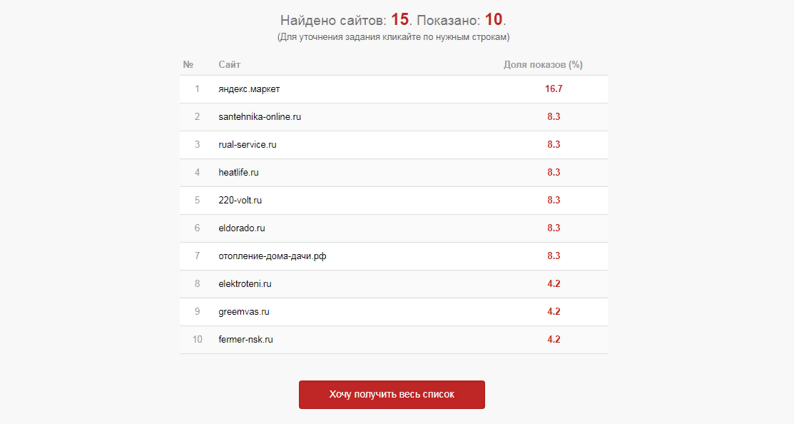 Сервис сформирует список из десяти сайтов-конкурентов, отсортировав их по доле показов.