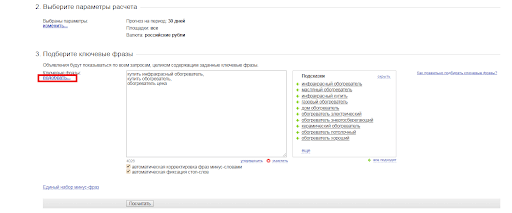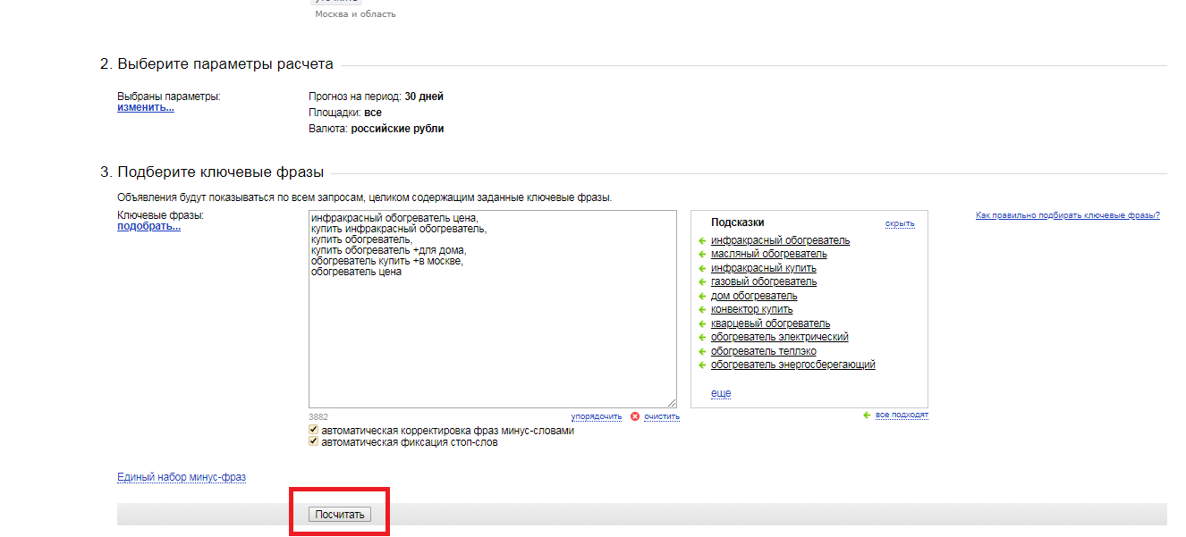 Выберите подходящие ключевые фразы, добавьте их в список и кликните по кнопке «Посчитать».