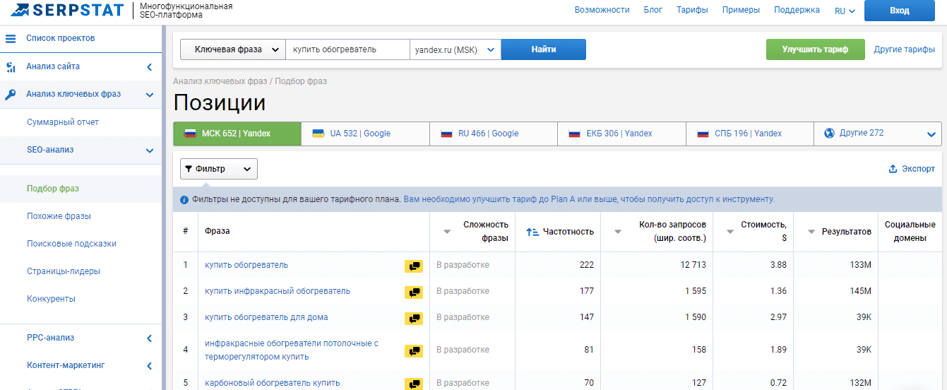 Чтобы использовать инструменты Serpstat для анализа конкурентов и ключевых фраз, не нужно покупать платную подписку.