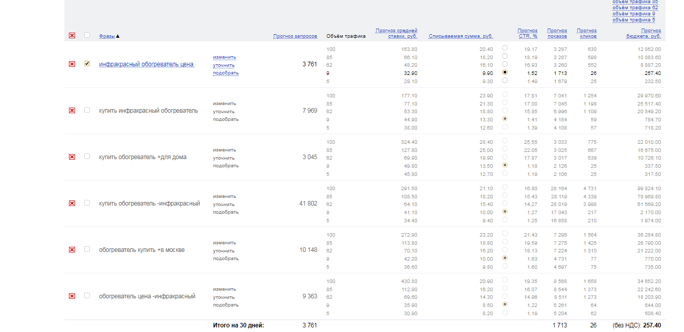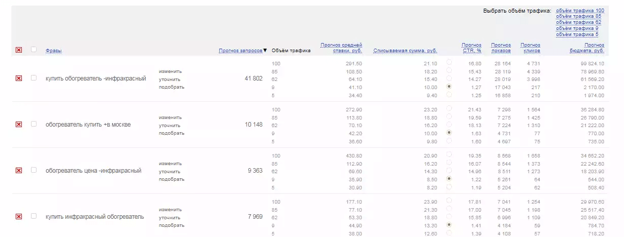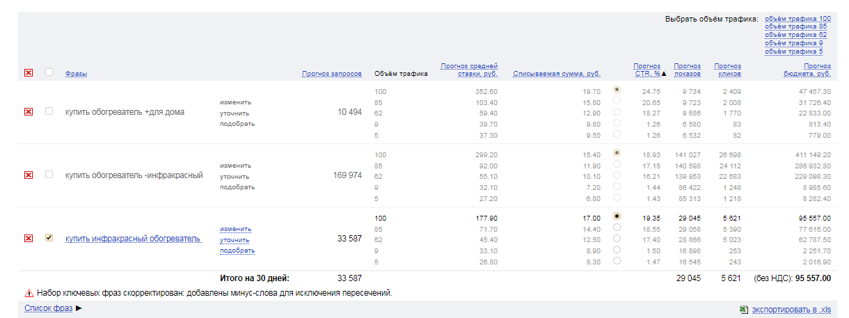 Сервис сформирует таблицу с прогнозом показов и кликов, приблизительным CTR, расходами по каждому ключевому слову.
