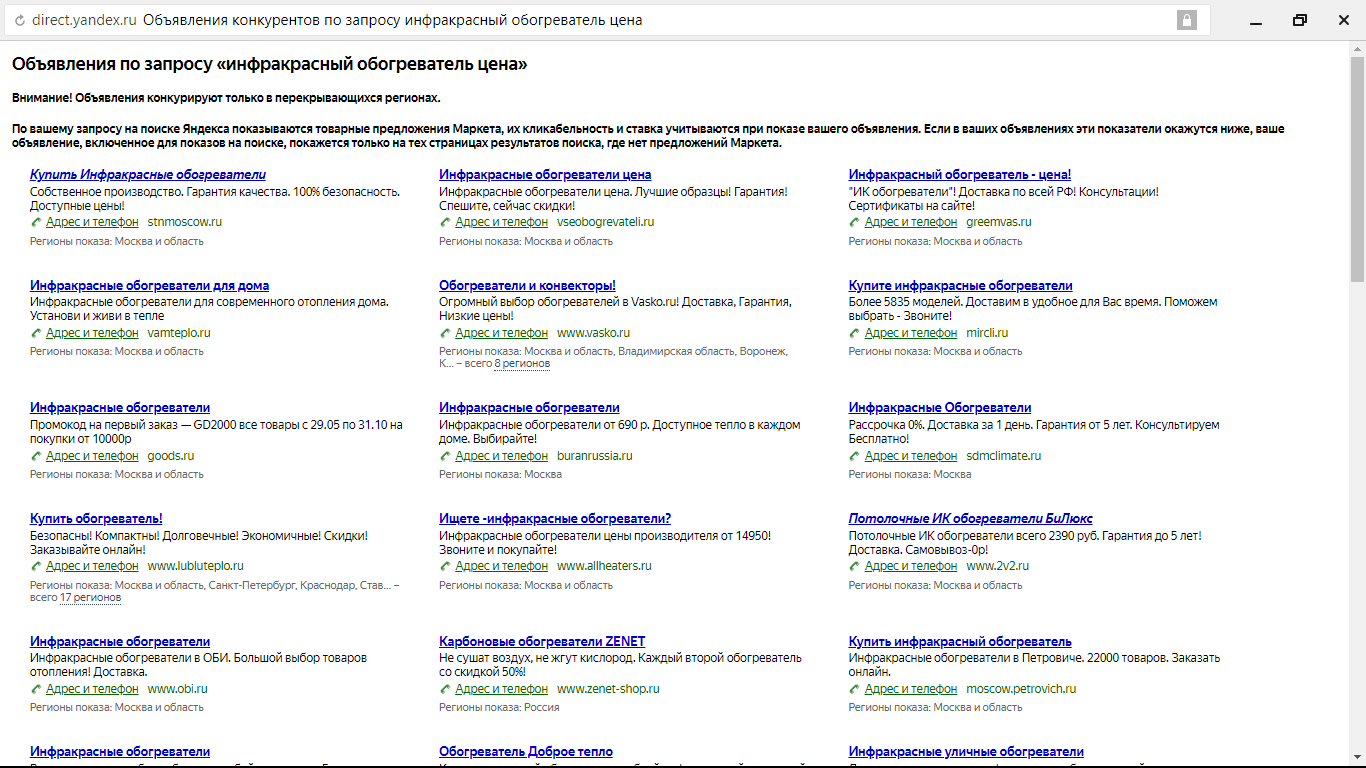 По нашему запросу — «инфракрасный обогреватель цена» — в Директе рекламируются минимум 50 сайтов. Большинство из них показывают объявления пользователям из Москвы и области. В списке также есть компании, которые продают технику не только в столице и области, но и в других регионах страны — например, в Краснодаре, Владивостоке, Воронеже.