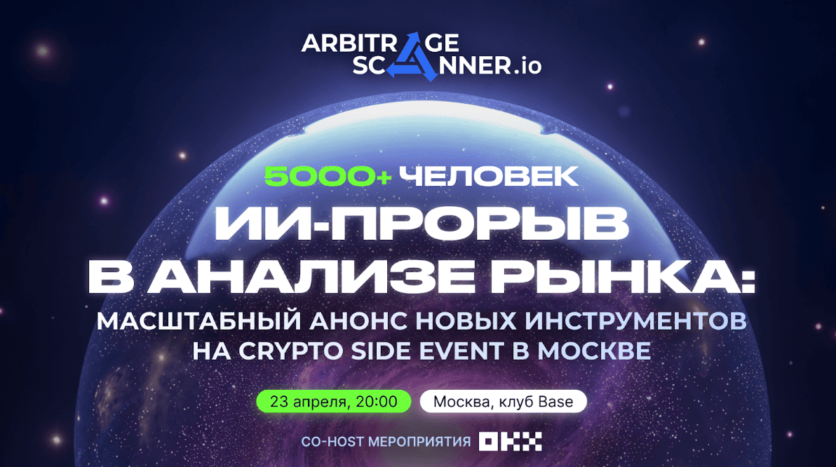 23 апреля 2025 года состоится главное крипто событие России: экосистема с инструментами для анализа рынка и поиска арбитражных связок ArbitrageScanner.io совместно с OKX - Tier 1 криптобиржей проведет закрытый сайд-ивент, на котором презентует свой новый продукт.