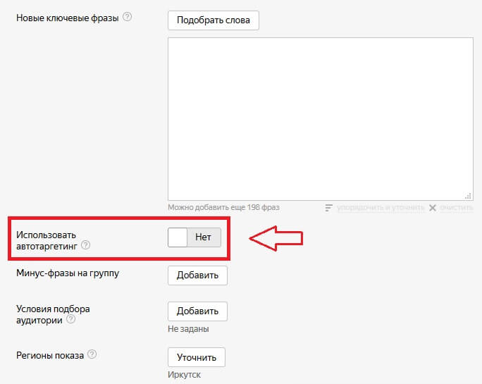 Чтобы настроить автотаргетинг, при настройке рекламной кампании Я. Директ, после создания объявления, чуть ниже выбора ключевых фраз, есть переключатель, который отвечает за функцию автотаргетинга — поставьте его в положение «Да».