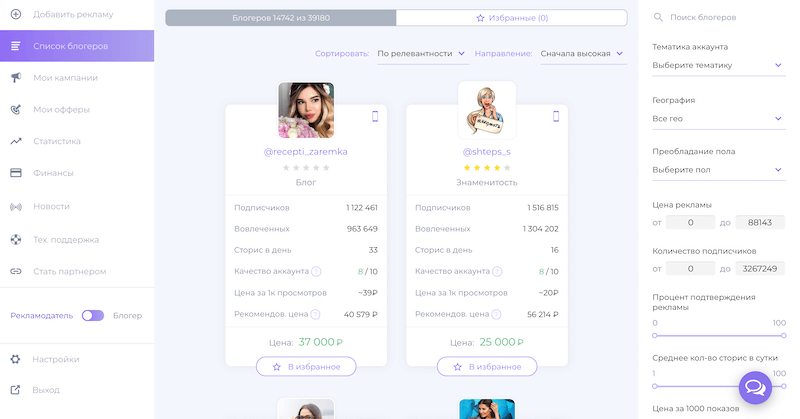 В систем удобная система фильтров, которая позволяет подобрать блогеров с учётом региона, охвата, стоимости, тематики и других дополнительных параметров. По каждому блогеру можно посмотреть дополнительную информацию: аудитория, примеры размещений, количество публикуемых сторис и прочее.