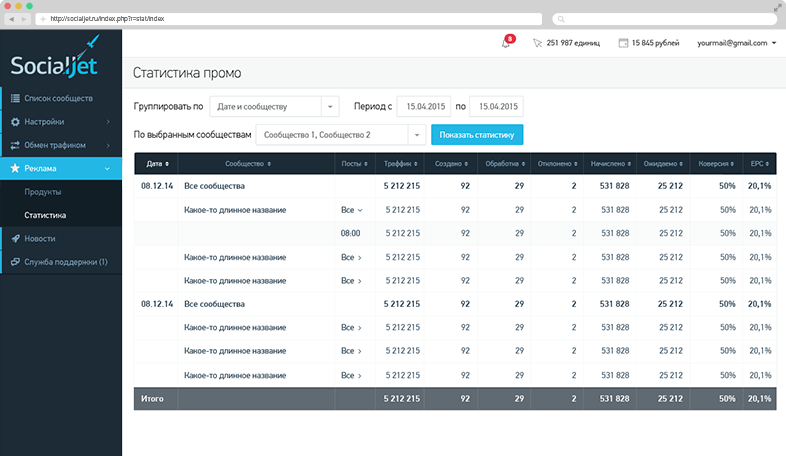 Сервис Adstamer демонстрирует итоговый результат в виде детальной статистики. Биржа взимает комиссию 15% от каждого успешного сотрудничества.