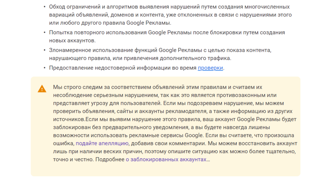 Если Google не посчитает нарушение серьезным, он вышлет предупреждение с описанием проблем за 7 дней до блокировки. Рекламодатель может исправить нарушения или доказать, что их не было, и тогда аккаунт не заблокируют. Инструкции по устранению нарушений будут в письме.