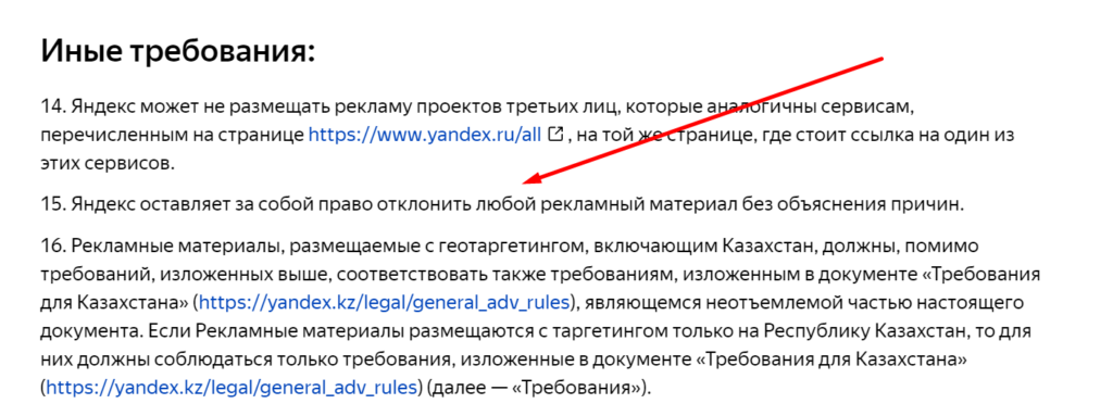 А еще есть пункт 15 этих требований, который позволяет Яндексу отклонять рекламу и блокировать аккаунты без объяснения причин.