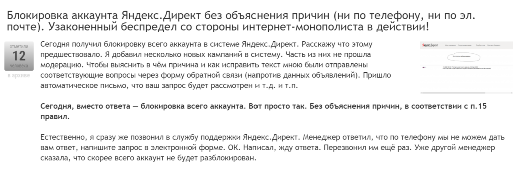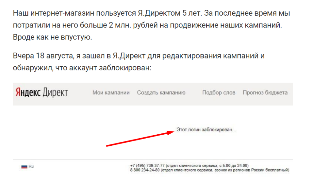 Компания рекламировалась в Директе без проблем в течение 5 лет. Внезапно аккаунт заблокировали, а техподдержка ответила стандартное — несоответствие материалов рекламной политике Яндекса. И хотя в итоге аккаунт разблокировали, ситуация не из приятных.