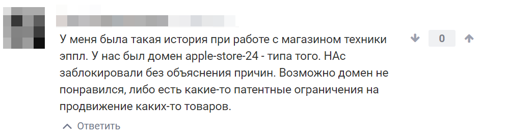 Заблокировали рекламу магазина техники Apple. Хотя блокировка для рекламодателя стала неожиданностью, вероятная причина — в использовании бренда Apple в доменном имени. Если компания — не официальный дилер, риск блокировки велик.