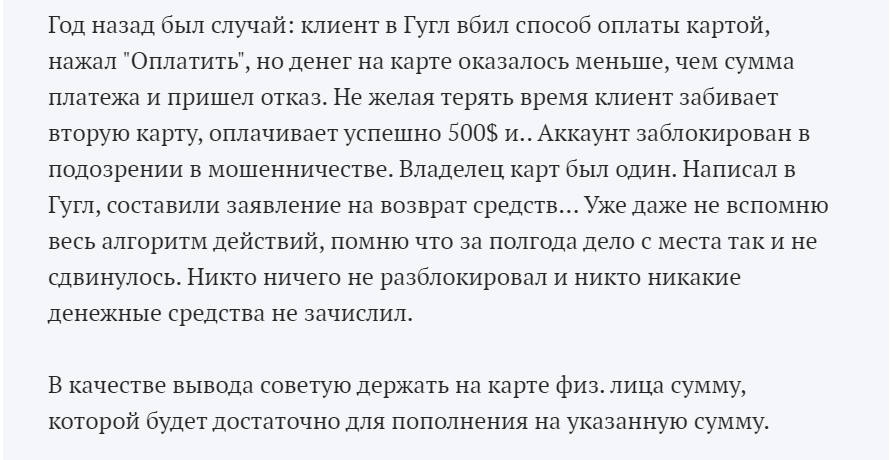 Google заподозрил мошеннические действия, потому что у пользователя на карте не хватило средств для пополнения счета.