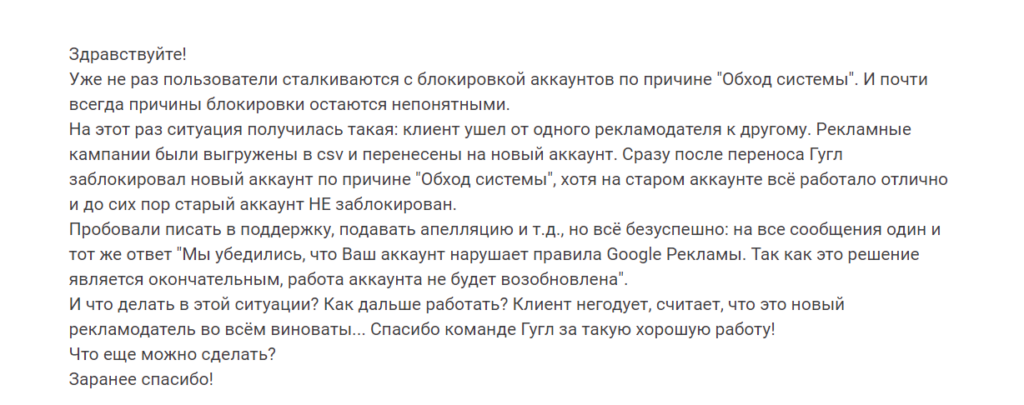 Внимательно изучив правила и ничего не нарушив, можно свести риски к минимуму. Но исключить их на 100 %, как и в Google Ads, не получится. Рассмотрим несколько реальных историй, чтобы понять неявные причины блокировок и избежать этого в своих аккаунтах.