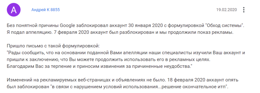 Если же апелляции не дают результатов и Google заблокировал ваш аккаунт навсегда, а рекламироваться все равно нужно, выход один — создавать новый аккаунт так, чтобы система не нашла связи с вашим заблокированным аккаунтом: менять сим-карту, IP-адрес, платежные реквизиты, сайт или даже компьютер, с которого настраиваете рекламу.