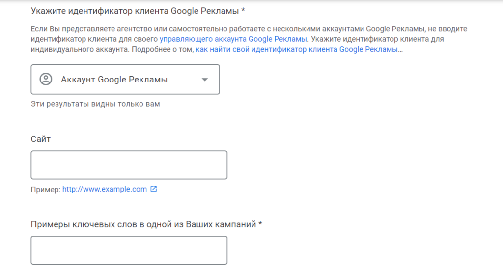 Среди прочего нужно будет указать сайт и примеры ключевых слов