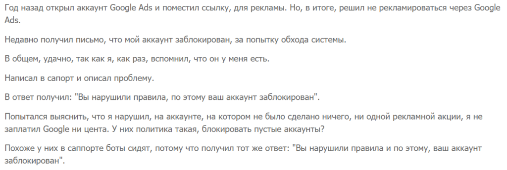 В постах о блокировках аккаунтов часто встречаются жалобы на то, что по почте и телефону техподдержка отвечает стандартными фразами, отказывается разбираться и вникать в ситуацию. Тогда может помочь вынос вопроса в публичное пространство, например, резонансный пост в Facebook*, который привлечет внимание представителей рекламной системы.
