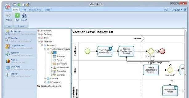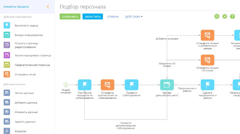 Это продукт российской компании ELMA. Моделировать бизнес-процессы можно в специальном графическом редакторе.