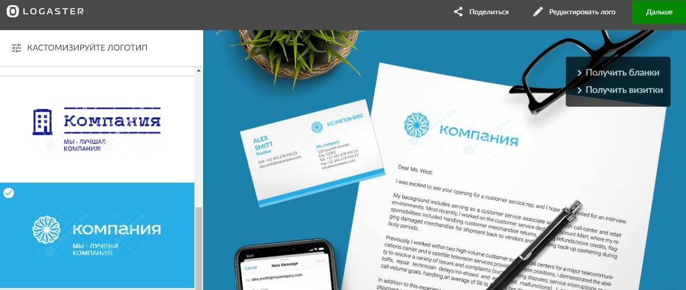 Logaster. Простой и интуитивно понятный сервис на русском языке. Вы можете ввести название, сферу деятельности, выбрать понравившиеся иконки, предпочитаемые цвета. Сервис выдаст разные варианты, которые можно кастомизировать по желанию. Также можно получить готовые бланки визиток, документов.