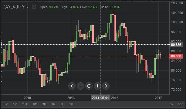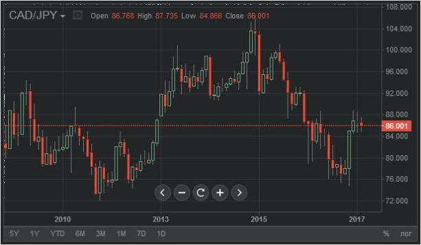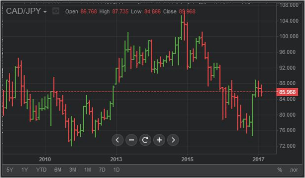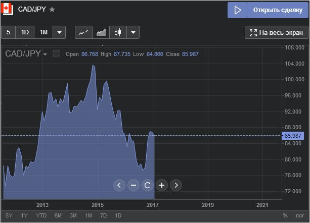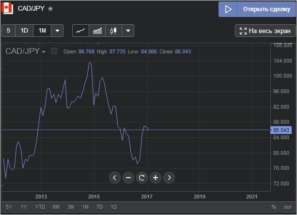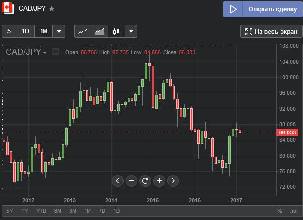 Возьмём в качестве экспериментального образца пару CAD/JPY (канадский доллар/японская йена) и проанализируем на её примере график.