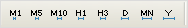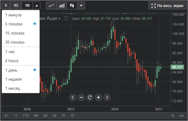 Временные интервалы отличаются от доступных в МетаТрейдере: есть 10-минутный, 3-часовой и годовой таймфреймы, но отсутствуют 15-минутка, 30-минутка, 4-часовой и недельный.