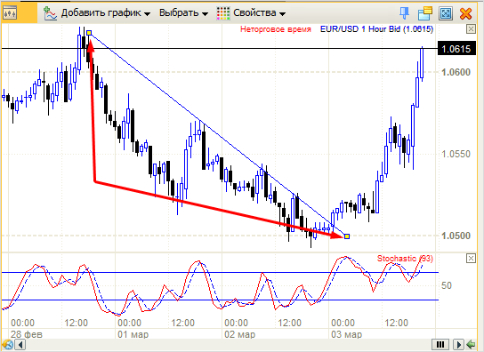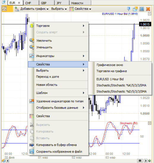 Бычьи свечи белые с синими границами, медвежьи – чёрные. Под графиком располагается окно индикатора. В нашем случае это осциллятор Stochastic, с которым детально ознакомимся в будущем. Если вы не планируете торговать с использованием индикаторов, просто закройте панель “крестиком”.