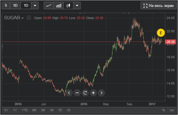 Доступно 6 инструментов, по каждому можно открывать сделки. График изменения цен на сахар (дневной таймфрейм).