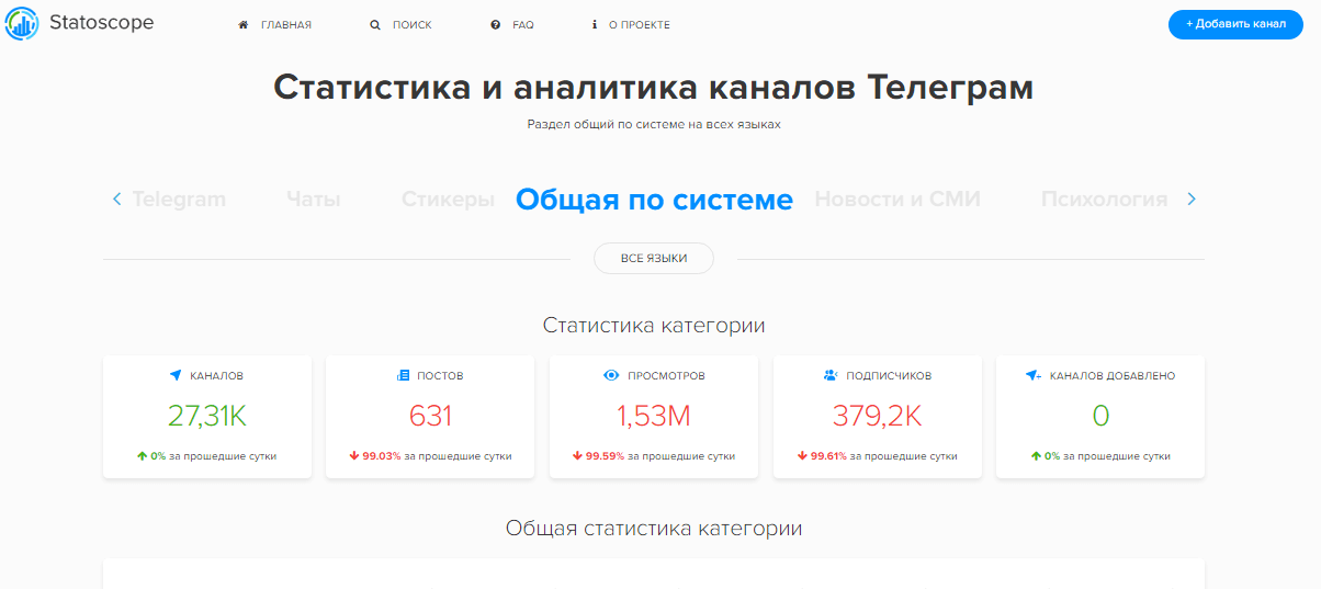 Statoscope – сервис, позволяющий просматривать статистику Телеграм-каналов по категориям за выбранный период – день, неделю, месяц, год.