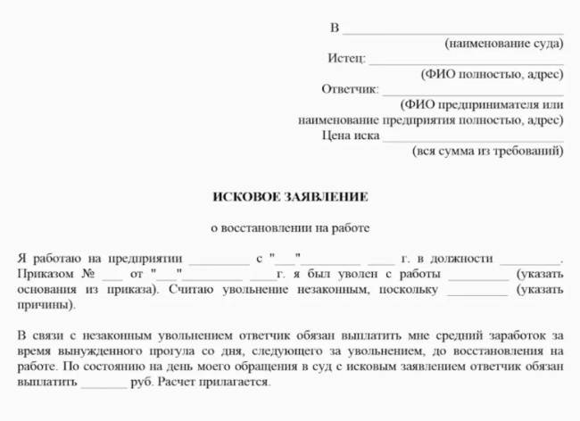 При обращении в судебный орган следует составить исковое заявление. Пример формы мы приложим ниже. Госпошлину платить не нужно: на это указывает статья 393 ТК РФ.