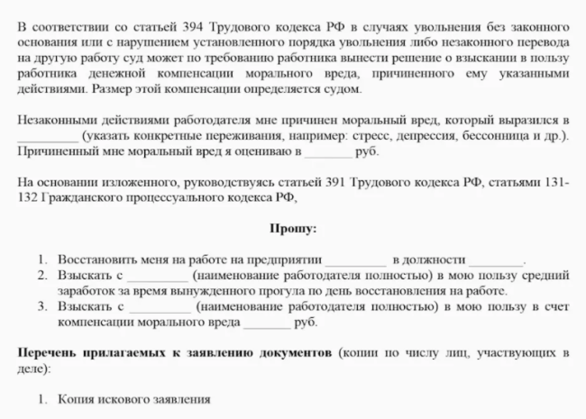 Кроме того, уволенный может потребовать компенсацию за моральный ущерб. А если после восстановления он не планирует продолжать работать в данной организации, в случае победы в суде ему должны исправить запись в трудовой и написать, что сотрудник уволен по собственному желанию.
