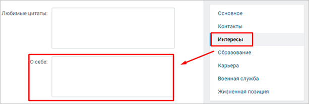 Заполните поля в соответствии с их тематикой. Это поможет гостям увидеть в вас неординарную личность и найти общие интересы. В самом низу есть графа «О себе».
