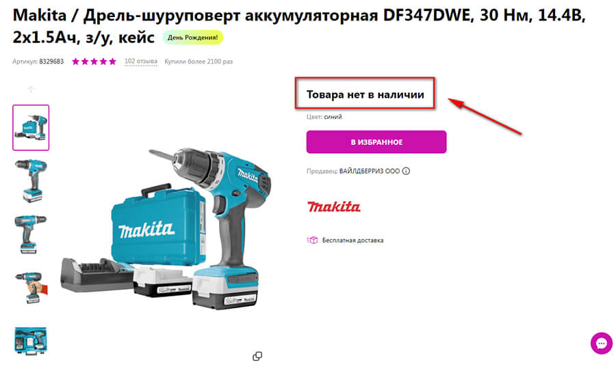 Пример — товар показывается на главной странице Вайлдберриз. На карточку переходят посетители, но шуруповерта нет в наличии. В лучшем случае потенциальный покупатель сохранит товар в закладки и купит позже, в худшем — уйдет к конкуренту или передумает покупать.