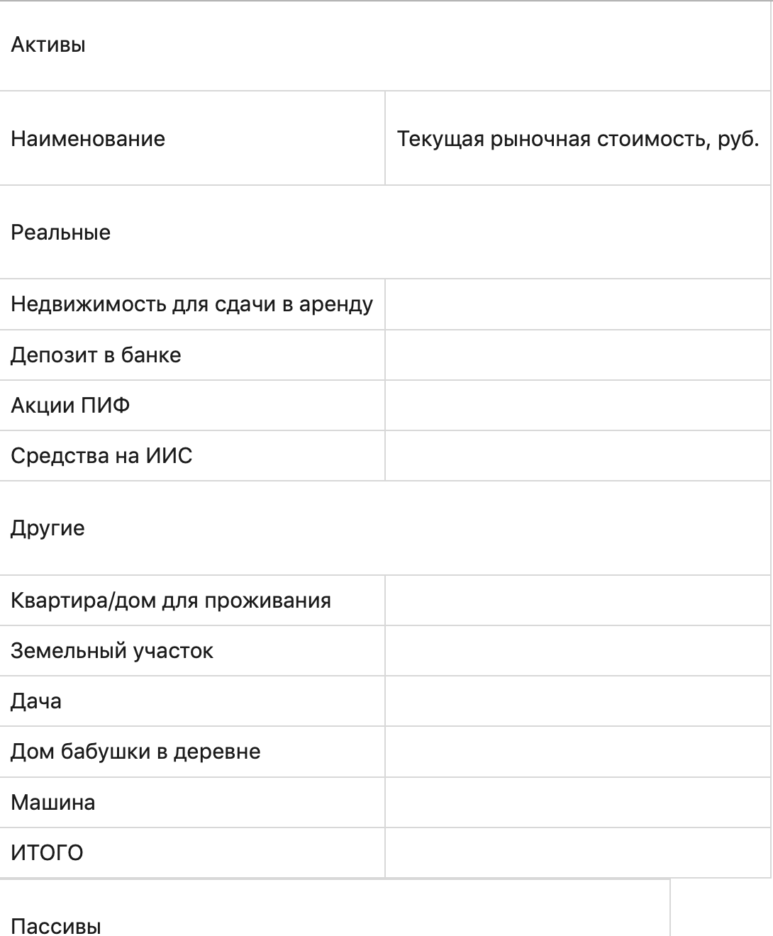 Составьте таблицу примерно по такому сценарию с собственным списком активов и пассивов