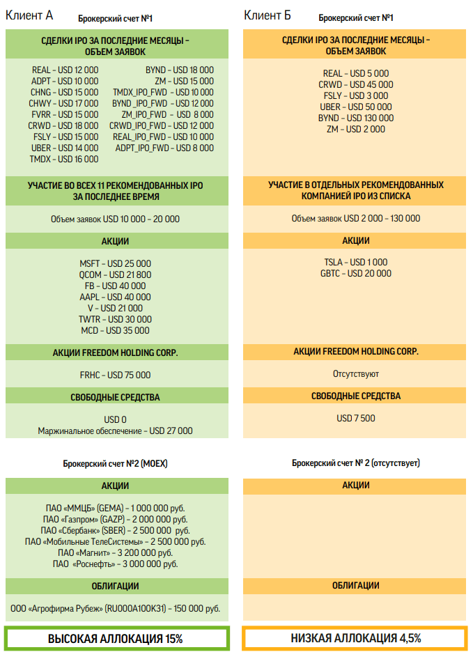 Брокер дает примерный расчет аллокации для двух разных клиентов. Один из них активный, другой – нет. Первый получит 15 %, второй – только 4,5 %. Алгоритмы расчета у разных брокеров будут отличаться, но подходы примерно одинаковые.