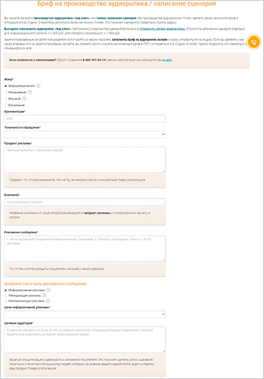 Пример 3. Бриф на аудиоролик/сценарий. Да, стиль не современен, но зато есть полный комплект вопросов, который поможет воплотить задумку заказчика.