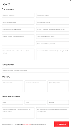 Заголовок в стиле “Бриф (название услуги)”. Внизу приписать всю важность заполнения и условия.