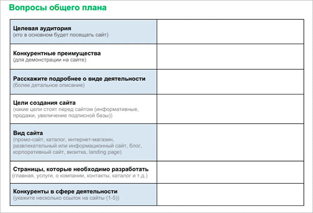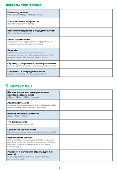 Остальные пункты зависят от вашей сферы деятельности. Копирайтеру важно узнать о стиле, объеме. Веб-дизайнеру важно понимать, какие цвета, разделы, формы блоков хочет видеть на сайте заказчик.