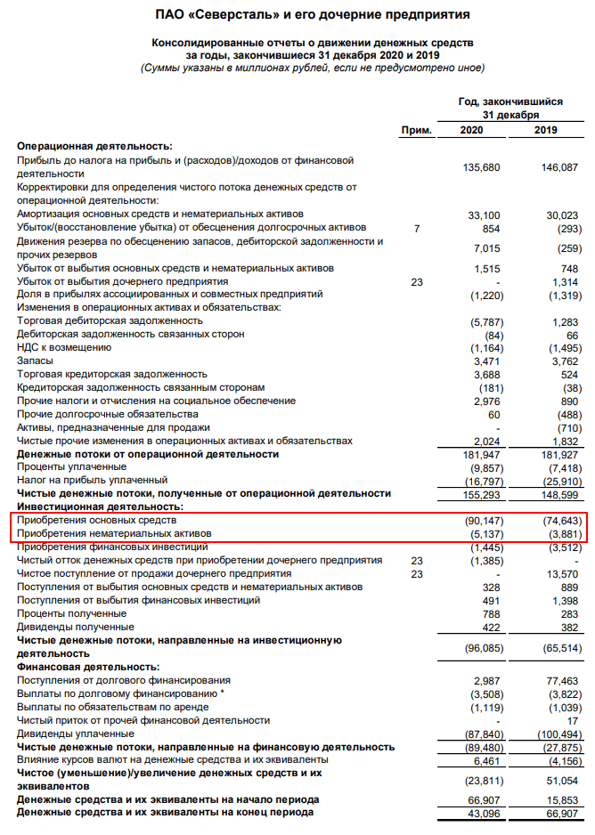 Не всегда капитальные затраты выделены отдельной строкой. Может встретиться, как, например, в отчете компании Северсталь за 2020 г.: