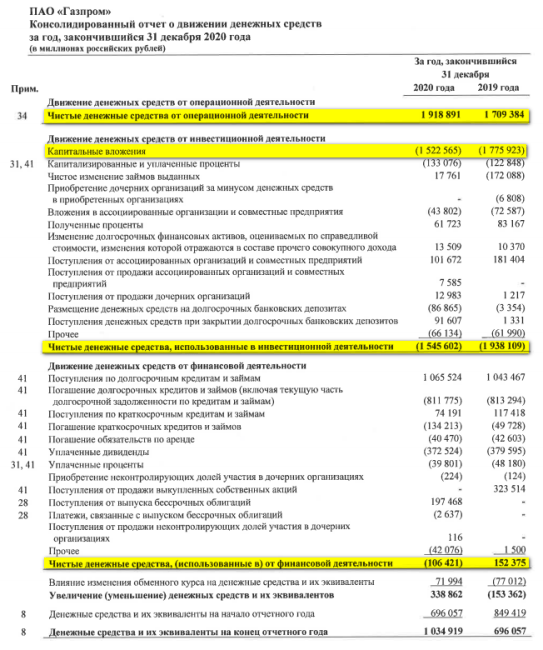 Данные для расчета FCF можно найти в Отчете о движении денежных средств по МСФО. Например, у Газпрома за 2020 г. мы видим следующие цифры.