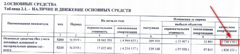 - Расчет по РСБУ (Отчет о финансовых результатах за 2019 г., Пояснения к бухгалтерской отчетности за 2019 г. – Таблица 2.1. “Наличие и движение основных средств”). Результат по приведенным выше четырем формулам получается одинаковым. Мы покажем расчет по 1-й, наиболее простой.