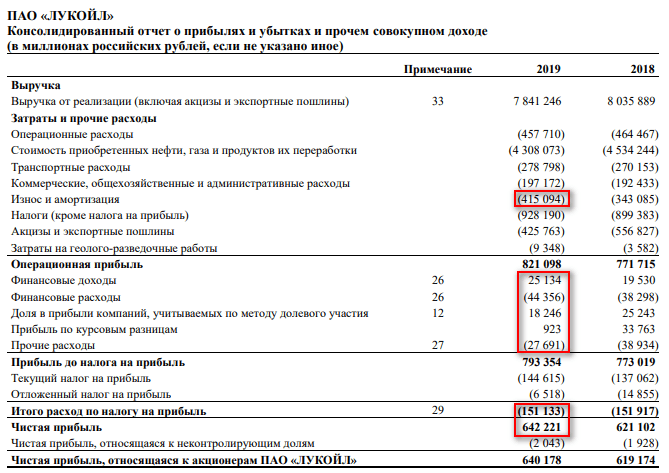 Рассмотрим расчет EBITDA по двум видам отчетности за 2019 год на примере нефтяного предприятия “Лукойл”.
