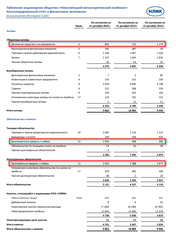 Рассмотрим, как рассчитать инвестору значение показателя EV конкретного предприятия. Для примера возьмем годовую отчетность по МСФО за 2020 г. представителя нашей металлургической отрасли – НЛМК. Нам потребуется Консолидированный отчет о финансовом положении. Его мы скачали на сайте НЛМК: